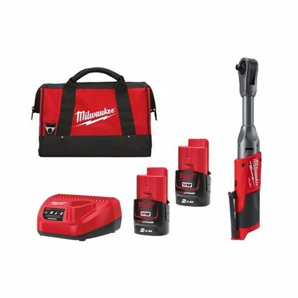1x Extended Reach Impact Ratchet, 2x Lithium Ion Batteries (2.0 Ah), 1x Charger (C12 C), 1x Tool Bag
